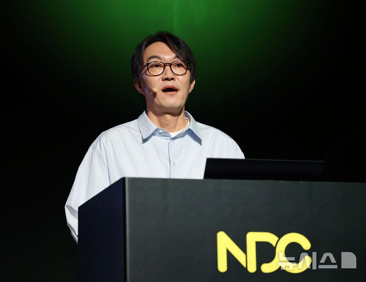 [성남=뉴시스] 김진아 기자 = 박용현 넥슨게임즈 대표가 24일 경기도 판교 경기창조경제혁신센터에서 열린 '넥슨 개발자 콘퍼런스(NDC)'에서 '우리가 빅 게임을 만드는 이유'를 주제로 기조강연을 하고 있다. 2025.06.24. bluesoda@newsis.com