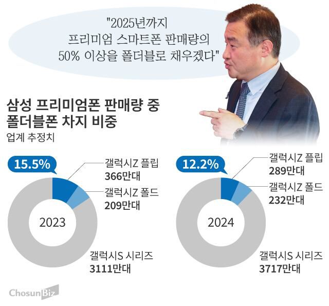 업계에 따르면 삼성 프리미엄폰 판매량 중 폴더블폰이 차지하는 비중은 2023년 15.5%, 2024년 12.2%로 3.3%포인트(P) 감소했습니다. 이런 상황에서 플립7 가격 마저 인상할 경우 노태문 사장이 3년 전 공언한 목표 달성은 무산될 가능성이 큽니다. 폴드7의 경우 퀄컴 AP 가격 인상 등을 고려하면 가격 인하 가능성이 없지만, 플립7은 가격을 낮출 수 있다는 주장에 힘이 실린 이유입니다.