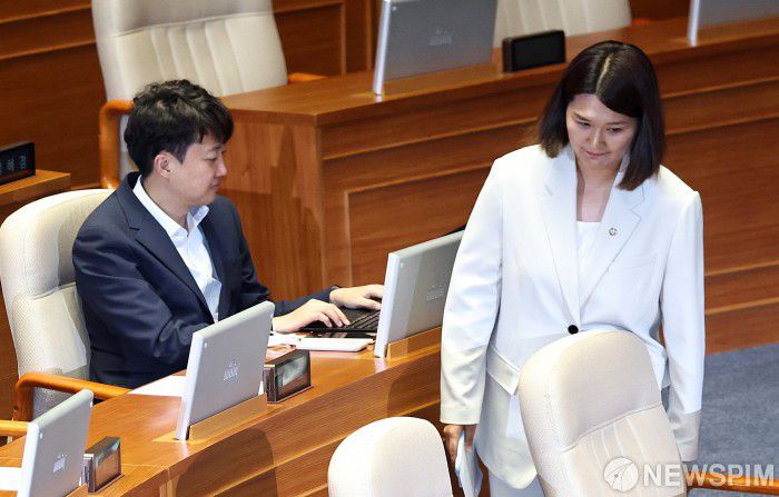 [서울=뉴스핌] 정일구 기자 = 비례대표 의원직을 승계한 손솔 진보당 의원이 27일 오후 서울 여의도 국회에서 열린 제426회 국회(임시회) 제3차 본회의에서 인사말을 마친 뒤 자리로 향하고 있다. 왼쪽은 이준석 개혁신당 의원. 2025.06.27 mironj19@newspim.com