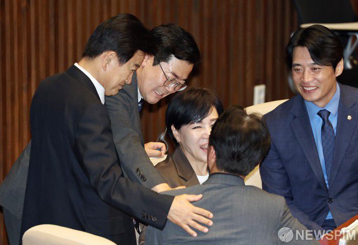 [서울=뉴스핌] 정일구 기자 = 정동영 통일부 장관 후보자(왼쪽), 박찬대 더불어민주당 의원, 김민석 국무총리 후보자가 27일 오후 서울 여의도 국회에서 열린 제426회 국회(임시회) 제3차 본회의에 참석해 인사를 나누고 있다. 2025.06.27 mironj19@newspim.com