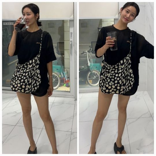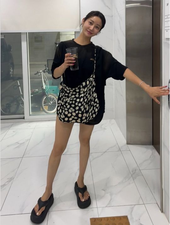 여기에 데이지 패턴의 캔버스백과 손에 든 유리컵 한 잔이 묘한 스타일링 포인트로 시선을 끌었다. 엘리베이터 앞에서 찍은 이 일상샷은 자연스러운 포즈와 미소, 뚜렷한 비율로 단번에 화제를 모았다.