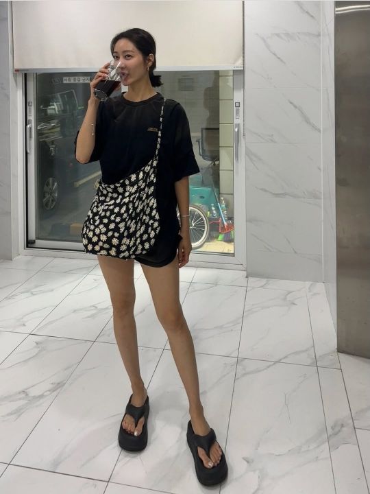 27일, 한그루는 SNS를 통해 블랙 오버핏 티셔츠에 숏팬츠, 플랫폼 슬리퍼를 매치한 캐주얼룩을 공개했다.