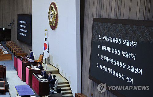 국회 운영위·법사위·문체위·예결위원장 선출(서울=연합뉴스) 김주성 기자 = 27일 국회 본회의에서 우원식 국회의장이 국회 운영위원장·법제사법위원장·문화체육관광위원장 보궐선거, 예산결산특별위원장 선거 결과를 발표하고 있다. 2025.6.27 utzza@yna.co.kr