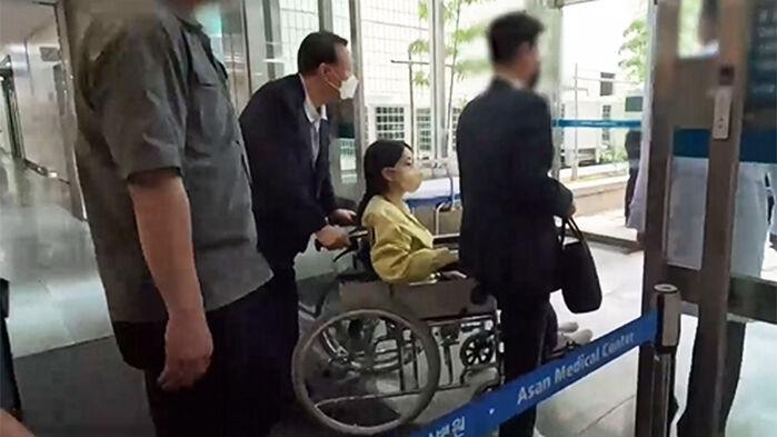 마스크를 쓴 채 휠체어를 탄 김건희 여사.