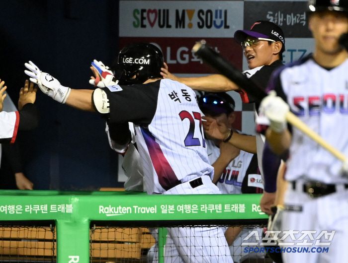 27일 잠실야구장에서 열린 KIA와 LG의 경기, 6회말 2사 1,3루 박동원이 역전 3점홈런을 치고 염경엽 감독의 환영을 받고 있다. 잠실=허상욱 기자wook@sportschosun.com/2025.06.27/