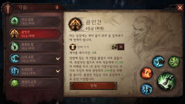 곰인간, 늑대인간 상태에서는 각각 전용 스킬이 추가로 활성화된다. 돌진, 광역 공격, 군중 제어기 등 다양한 스킬이 있다. 자원을 빠르게 회전시키면 자연스럽게 변신 형태가 유지된다. 버튼 배치가 복잡하진 않지만, 회전률과 쿨타임을 관리해야 하니 손이 심심하지는 않다.