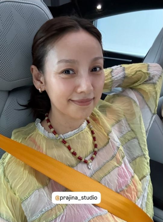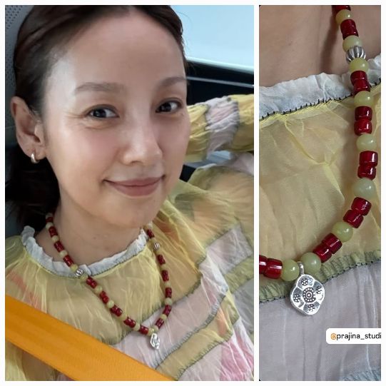또한 이날 함께 포착된 건 그의 목에 걸린 붉은 비즈 목걸이였다. 원석을 연상케 하는 황색 구슬과 은빛 펜던트, 그리고 은근한 비대칭이 감도는 스타일링은 이효리 특유의 내추럴 감성과 조화를 이루었다. ‘@prajina_studio’ 태그를 통해 또 다른 힙한 무드까지 전한 셈이다.