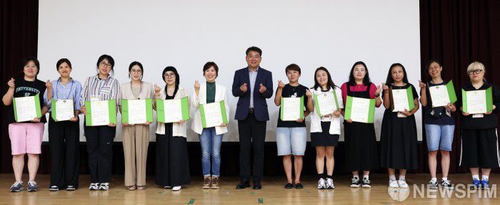 [서울=뉴스핌] 양윤모 기자 =오승록 노원구청장이 27일 오후 서울 노원구청 대강당에서 열린 우수식재료 김치 공동구매 품평회에 참석해 안심식재료 모니터링단 위촉식을 가진 뒤 기념촬영을 하고 있다.   품평회는 성장기 학생들의 건강을 위해 안전하고 질 높은 김치의 안정적 공급체계를 구축하고자 구가 지난 2012년도부터 개최해왔다. [사진=노원구청] 2025.06.27 yym58@newspim.com