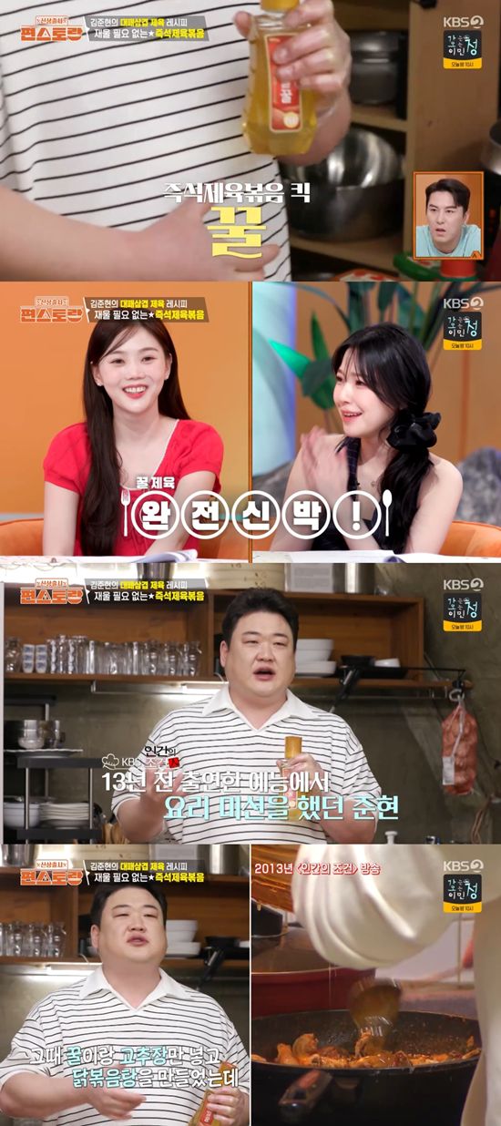 즉석제육볶음을 만들겠다고 밝힌 김준현은 "다들 제육의 레시피는 있다. 근데 정확한 건 먹어보면 맛이 확실히 다르다. 이게 중요하다"라며 요리에 자신감을 보였다. 또 그는 "오늘 제육의 키포인트는 꿀이 들어가야 한다"라고 밝혔다.