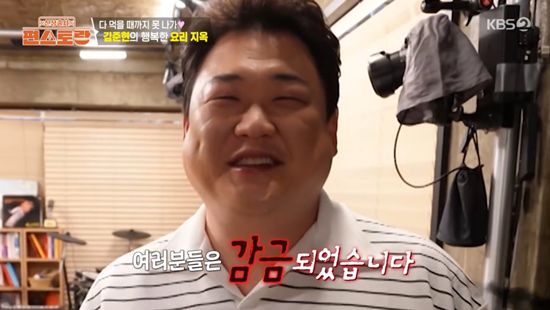 문을 연 김준현은 "밥 먹었냐. 오늘 많이 먹어야 된다. 문 잠그겠다. 여러분은 감금됐다. 못 나간다. 지옥에 오신 걸 환영한다"라며 제작진을 맞이했다. 이어 그는 "들어올 때는 마음대로 들어오지만 나갈 때는 마음대로 못 나간다"라고 말해 웃음을 자아냈다.