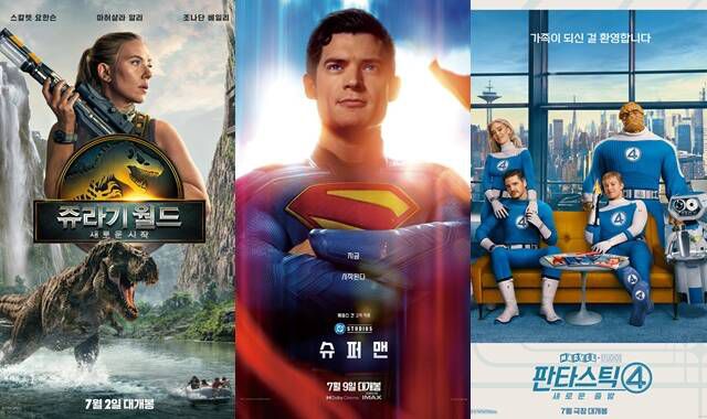 영화 '쥬라기 월드: 새로운 시작' '슈퍼맨' '판타스틱 4: 새로운 출발'(왼쪽부터)이 7월 극장가에 걸린다. /작품 포스터 |