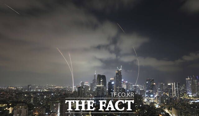 이스라엘의 방공 시스템 아이언 돔이 6월 15일(현지시간) 이스라엘 텔아비브 상공에서 이란이 발사한 미사일을 요격하기 위해 작동하고 있다. /텔아비브=AP.뉴시스