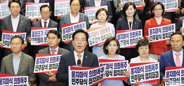 국민의힘은 이날 민주당이 국민의힘 반대에도 상임위원장 표결을 강행하자 국회 본회의장에서 퇴장했다. 이어 국회 본회의장 앞 계단에서 ‘상임위원장 선출 강행 규탄대회’를 열었다. 국민의힘 의원들은 “이재명 대통령이 대선 후보 TV 토론에서 ‘소통과 대화, 협치를 복원하겠다’고 이야기했는데 채 한 달이 안 돼 새빨간 거짓말임이 드러났다”고 말했다. 국민의힘 의원들은 로텐더홀에서 ‘묻지마식 의회 폭주 민주당식 협치 파괴’라는 피켓을 들고 구호를 외쳤다.