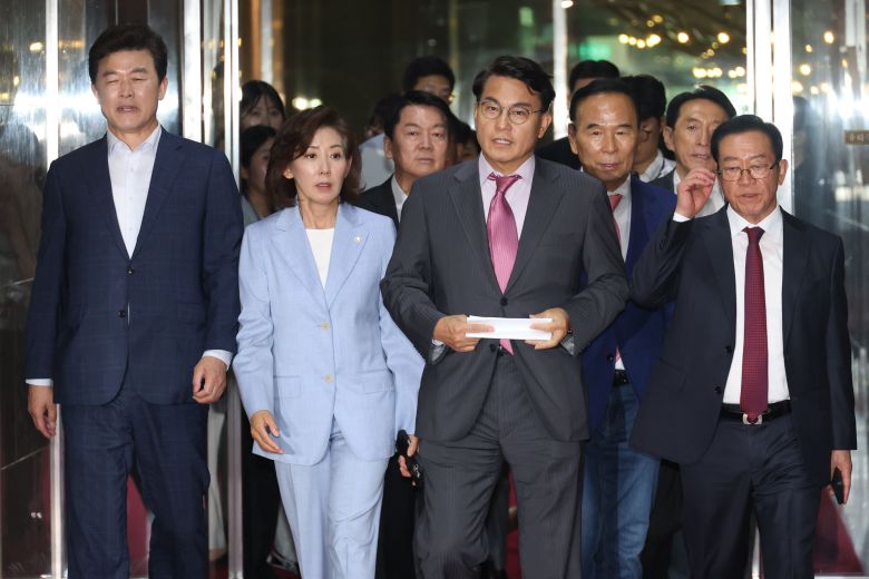 나경원,윤상현 등 국민의힘 중진의원들이 27일 오후 서울 여의도 국회에서 현재 공석인 상임위원장 선출을 위한 본회의를 앞두고 국회의장실을 방문하고 있다./뉴스1 |