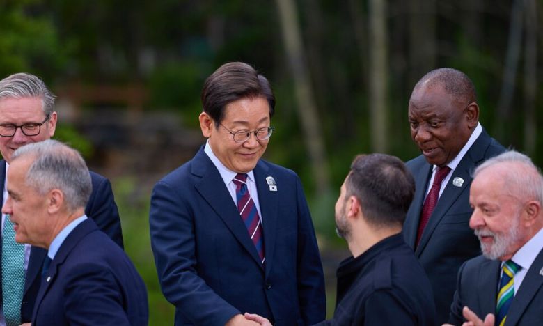 이재명 대통령이 17일(현지시각) 캐나다 앨버타주 캐내내스키스 주요 7개국(G7) 정상회의장에서 기념 사진을 촬영한 뒤 볼로디미르 젤렌스키 우크라이나 대통령과 악수를 하고 있다. 캐내내스키스/김태형 기자 xogud555@hani.co.kr |