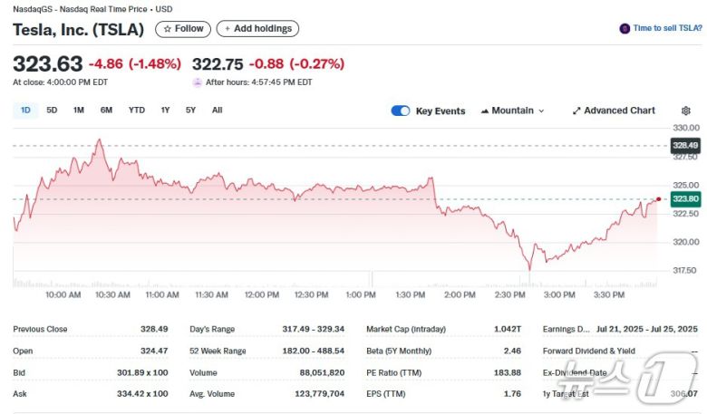 27일(현지시간) 뉴욕증시에서 테슬라는 1.48% 하락한 323.63달러를 기록했다. 이로써 시총도 1조420억달러로 줄어 시총 1조달러를 겨우 턱걸이했다.
