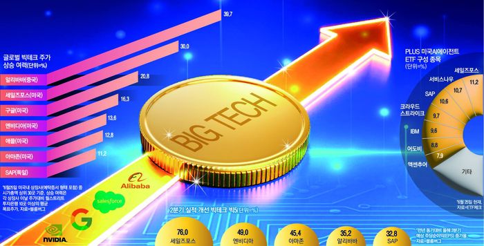 글로벌 빅테크에 분산 투자하려면 국내 상장 ETF가 대안이 된다. 마이크로소프트 AI 서비스 ‘코파일럿’에 물어보니 ‘PLUS 미국AI에이전트’ ETF를 답으로 내놨다. 이날 현재 구성 종목으로 세일즈포스(11.2%) SAP(10.6%) 등을 비중 있게 담고 있다. 국내 상장 ETF이므로 연금저축펀드 등 절세 계좌에 투자할 수 있다.