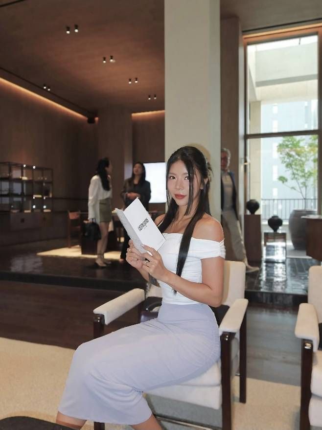 화이트 오프숄더를 입고 의자에 앉은 제이제이는 조용히 메뉴판을 들었다. 사진=제이제이 sns |