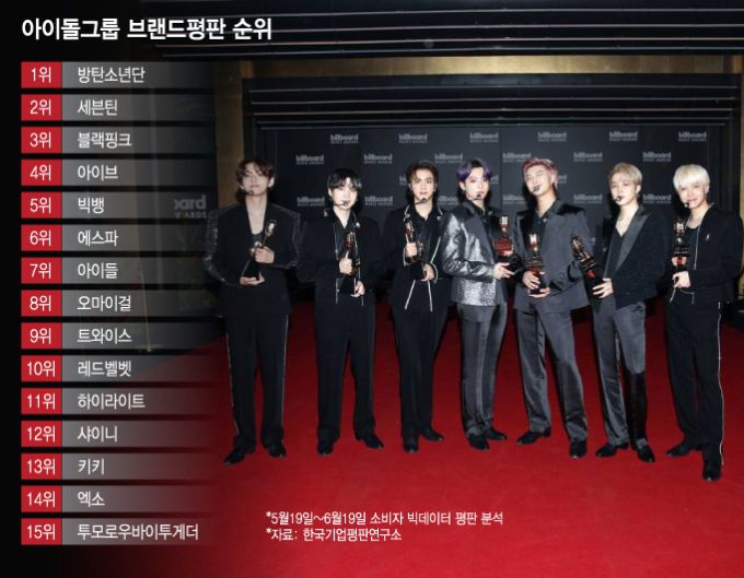 28일 한국기업평판연구소에 따르면 이달(지난달 19일부터 이달 19일까지) 빅데이터 평판을 분석한 결과 방탄소년단이 1위에 올랐다. 세븐틴(2위)과 블랙핑크(3위)가 뒤를 이었다.