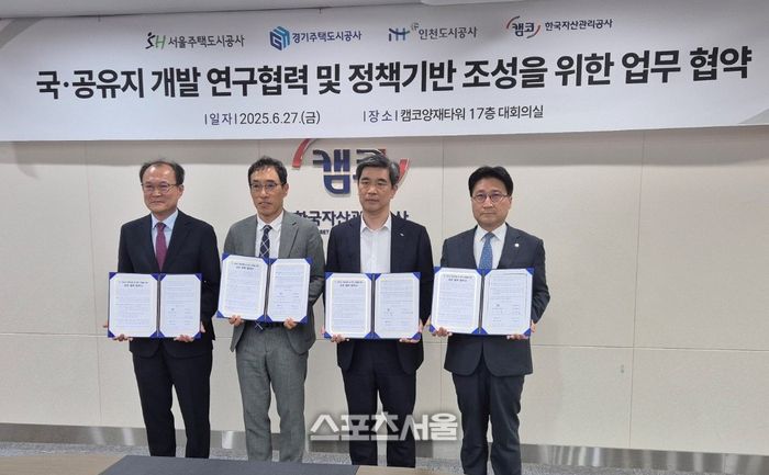 〔스포츠서울│수원=좌승훈기자〕경기주택도시공사(GH)는 한국자산관리공사(KAMCO), 서울주택도시공사(SH), 인천도시공사(iH)와 27일 서울 캠코 양재타워에서 ‘국·공유지 복합개발 및 현안 지원을 위한 상호협력 협약’을 체결했다.