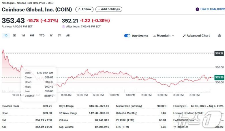 27일(현지 시간) 뉴욕증시에서 코인베이스는 4.27% 급락한 353.43달러를 기록했다.