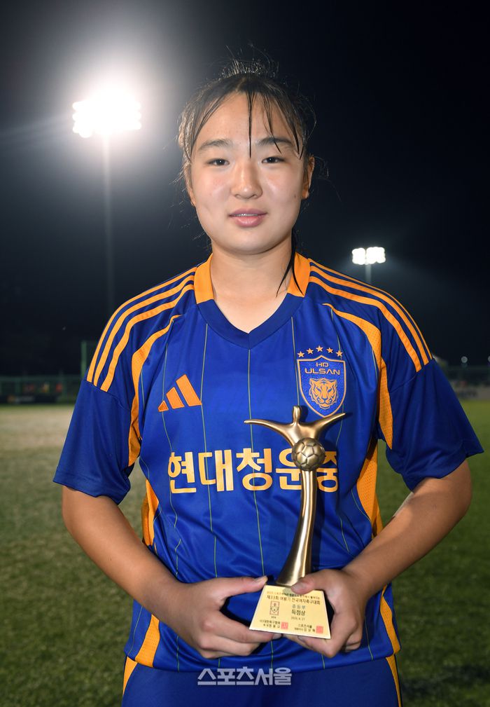 울산 현대청운중 임지혜가 27일 경남 합천에서 열린 ‘2025 스포츠케이션 명품도시 합천에서 펼쳐지는 제33회 여왕기 전국여자축구대회’ 중등부 시상식에서 득점상을 수상한 뒤 취재진을 향해 포즈를 취하고 있다. 2025. 6. 27.합천 | 박진업 기자 upandup@sportsseoul.com |