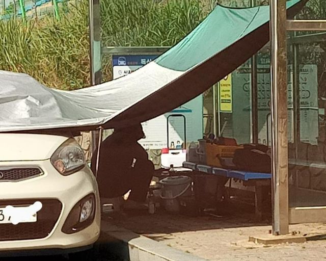 지난 26일 온라인 커뮤니티 보배드림에는 충남 보령 독산해수욕장 버스정류장 앞의 모습을 찍은 사진이 올라왔다. 사진에는 한 여성이 차량과 버스정류장 사이 공간에 그늘막을 치고 바구니와 해루질 용품 등을 늘어놓은 채 개인 공간으로 활용하고 있다.