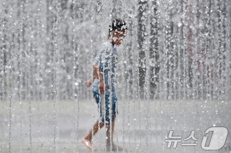 대구·경북에 올여름 첫 폭염주의보가 발효된 27일 오후 대구 서구 평리공원 바닥분수에서 어린이가 물장난을 치며 더위를 식히고 있다. 2025.6.27/뉴스1 ⓒ News1 공정식 기자