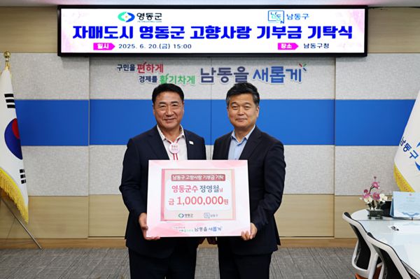 정영철 영동군수는 2023년부터 3년 연속 고향 사랑 기부금을 기탁하여 지역 간 끈끈한 유대와 실질적인 교류의 본보기를 보여줬다. 전달된 기부금은 '남동구 고향사랑 기금'으로 적립돼 주민 복리 증진과 지역 발전을 위한 재원으로 활용될 예정이다.