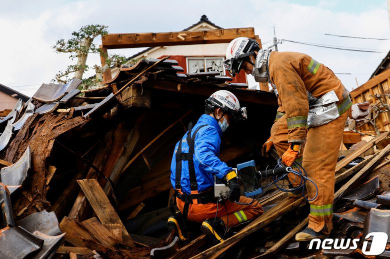 4일(현지시간) 일본 이시카와현 와지마시에서 경찰 인력이 무너진 가옥에서 실종 여성을 찾고 있다. 혼슈 중서부 이시카와현 노토반도에서는 지난 1일 오후 4시 10분쯤 규모 7.6 강진이 발생했다. 2024.01.04 ⓒ 로이터=뉴스1 ⓒ News1 최종일 기자