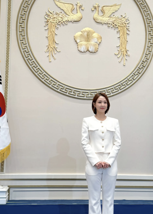 공개된 사진 속 오정연은 단정한 화이트 수트를 입고 행사장에 선 모습으로, 청와대 공식 문양 앞에서 기품 있는 미소를 짓고 있다. 또 다른 사진에서는 화려한 샹들리에가 빛나는 행사장 내부에서 행사 진행 시나리오를 들고 밝게 웃고 있다.