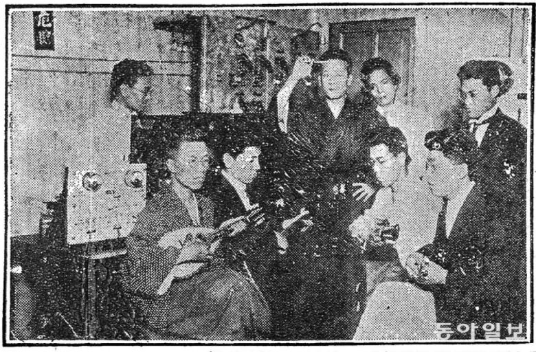 동아일보 1925년 6월 26일자 6면에는 ‘무선전화 정기 시험방송’ 기사와 함께 아주 흥미로운 사진 한 장이 실렸습니다. 체신국 시험방송실에서 음악을 방송하는 장면입니다. 헤드폰을 쓴 방송국 직원 앞에 기타를 든 서너명의 사람들이 앉아 있습니다.