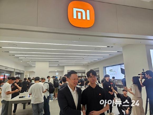 조니 우 샤오미코리아 사장(왼쪽)이 28일 서울 여의도 IFC몰 샤오미 플래그십 스토어 1호점 앞에서 기념 촬영을 하고 있다. [사진=설재윤 기자] |