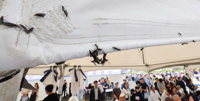 지난 27일 인천 서구 신검단중앙역에서 열린 인천도시철도 1호선 검단연장선 개통기념식장 텐트에 러브버그들이 몰려들어 붙어 있다.(사진=연합뉴스 제공) |