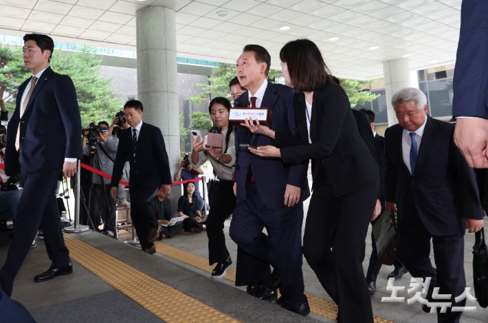 윤석열 전 대통령이 28일 오전 대면 조사를 받기 위해 서울 서초구 서울고검에 마련된 내란특검 사무실로 출석하고 있다. 황진환 기자