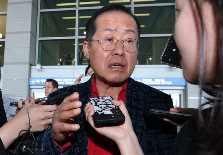 국민의힘 대선 경선에서 탈락한 뒤 정계 은퇴를 선언하고 하와이로 떠났던 홍준표 전 대구시장이 17일 인천국제공항을 통해 귀국해 인터뷰를 하고 있다. 뉴스1