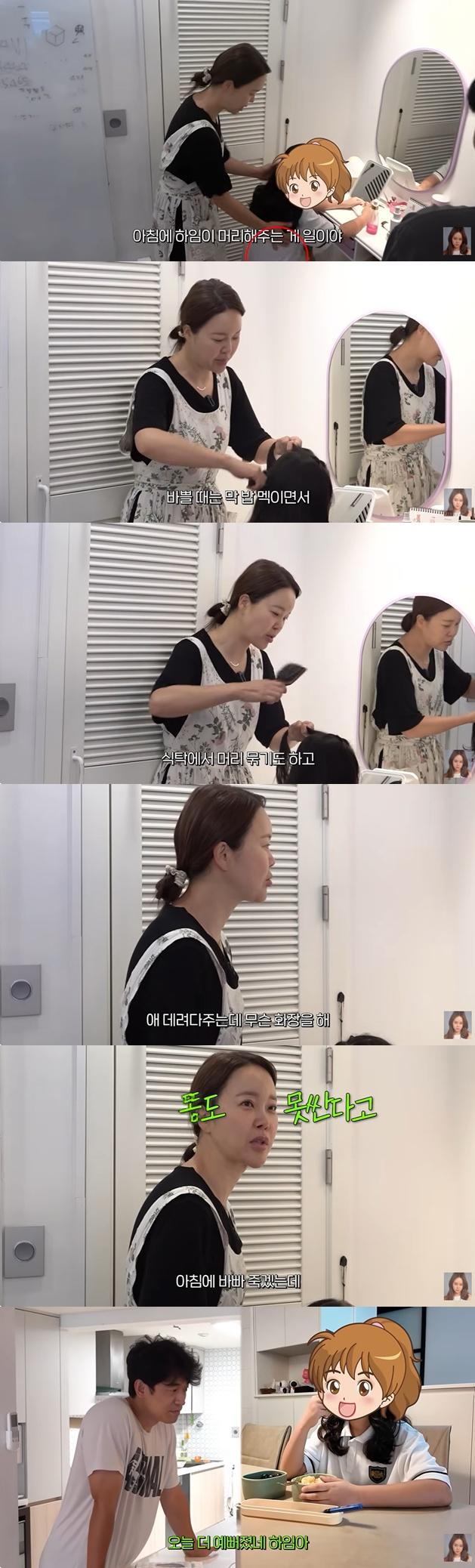 이날 백지영은 딸의 등원을 위해 이른 아침부터 분주하게 움직였다. 화장대에 앉아 있는 딸의 머리를 빗겨주던 그는 "아침에 하임이(딸) 머리해주는 게 일이다"며 "바쁠 때는 밥 멕이면서 식탁에서 머리 묶기도 한다"고 고충을 토로했다.