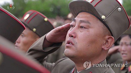 (서울=연합뉴스) 북한TV가 26일 원산갈마해안관광지구 준공식을 방영한 영상에 김정은 국무위원장이 참석하자 이 모습을 지켜보던 한 인민군 군인이 격정에 북받쳐 눈물을 흘리는 모습이 클로즈업 했다. 방송은 또한 여러 북한 주민들이 눈물을 흘리는 모습을 방영했다. 이는 북한 김정은 위원장의 애민통치를 부각하려는 시도로 보인다. [조선중앙TV 화면] 2025.6.28