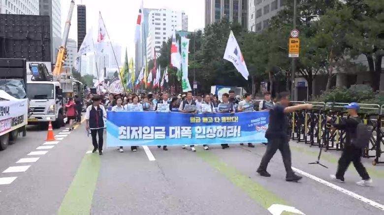 오늘(28일) 오후 서울 도심에서는 최저임금 대폭 인상을 요구하는 민주노총의 대규모 집회가 열렸습니다.