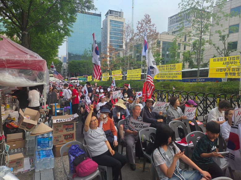 집회 참가자들은 ‘사법 수호, 정치 수호’ ‘윤 어게인’ 등의 문구가 적힌 손팻말을 들고 “이재명 구속”을 연신 외쳤다. 일부 지지자들은 이재명 대통령의 얼굴과 함께 ‘Not my president’라는 문구가 적힌 손팻말을 흔들었다.