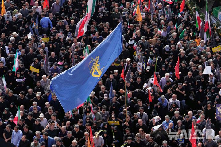 [테헤란=AP/뉴시스] 28일 이란 테헤란에서 거행된 이스라엘 공습으로 사망한 군 지휘관과 핵 과학자 장례식이 많은 시민이 모여있다. 2025.06.28.