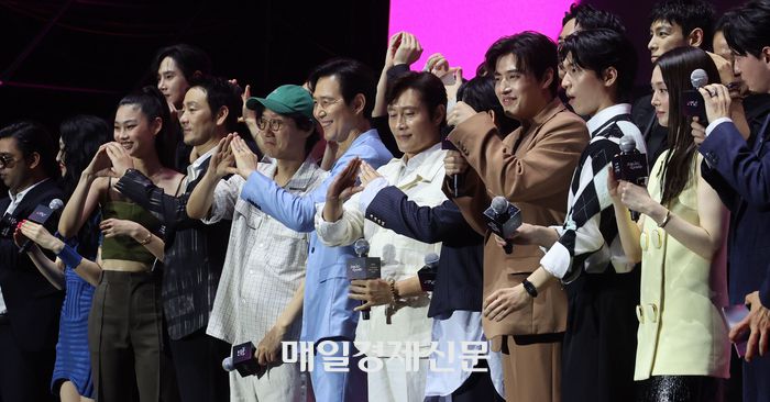 28일 서울광장에서 열린 ‘오징어 게임 시즌3’ 팬 이벤트에서 황동혁 감독, 이정재, 이병헌을 비롯한 배우들이 기념촬영을 하고 있다. 2025.6.28 [이승환기자]