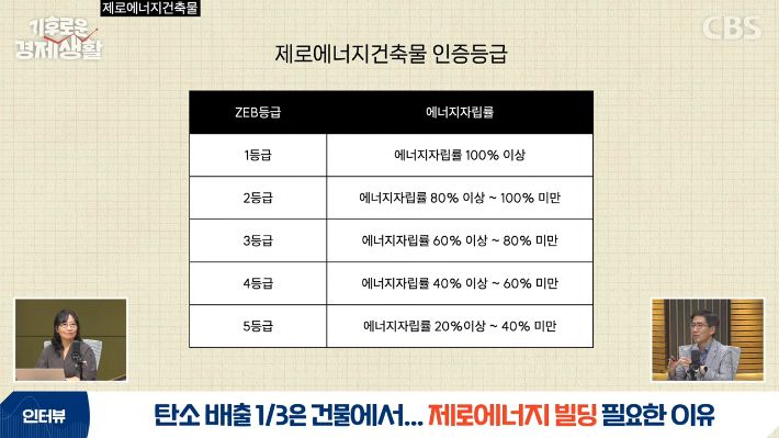 ◇ 이명주> 1등급이 돼야 소비량 대비 생산량이 100%가 되는 거잖아요. 그래서 120%가 되면 플러스 등급이 주어집니다. 그렇다면 1이 되고도 20%를 더 생산했을 때 플러스 등급이잖아요. 올해 6월부터 하는 민간 공동주택은 제로에너지 기준이 아니고 제로에너지 수준이에요. 그러면 5등급 수준이니까 5등급이 안 된다는 거죠.