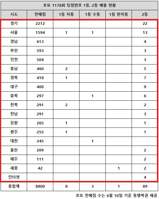 로또 1178회 당첨번호 조회 결과 1등을 배출한 지역은 전국 17개 시도 중 인구에 비례해 로또복권 판매점이 두 번째로 많은 서울 1594곳 중 2곳(자동 1곳·수동 1곳), 충남 460곳 중 2곳(자동), 경북 418곳 중 1곳(자동), 충북 297곳 중 1곳(수동), 전북 291곳 중 2곳(자동), 강원 265곳 중 1곳(자동), 광주 255곳 중 1곳(자동), 대전 245곳 중 1곳(수동), 세종 42곳 중 1곳(반자동)이다.