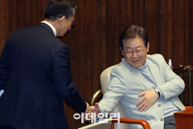 이재명 당시 더불어민주당 전 대표와 정성호 의원이 4월 14일 오후 서울 여의도 국회에서 열린 제424회 국회(임시회) 제2차 본회의에서 인사하고 있다.(사진=이데일리 노진환 기자) |