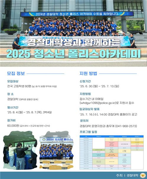 [서울=뉴스핌] 박우진 기자 = 경찰대학은 오는 8월 4일부터 7일까지 3박 4일간 전국 고등학생 60명을 대상으로 하는 '2025 청소년 폴리스 아카데미' 참가자를 모집한다.