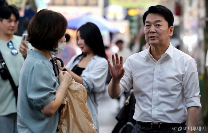 [대구=뉴시스] 이무열 기자 = 안철수 국민의힘 의원이 18일 대구 중구 서문시장을 찾아 시민과 대화하고 있다. 2025.06.18. lmy@newsis.com /사진=이무열