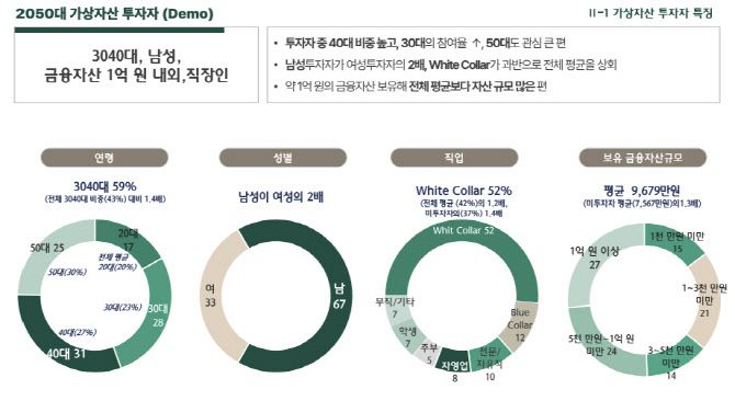 가상자산 투자자들의 평균 금융자산은 9679만원으로 미투자자 평균(7567만원)의 1.3배 수준이었다. 적극·공격적 투자성향은 투자자(38%)와 미투자자(11%)간에 3.5배 차이를 보여 가상자산 투자 참여의 중요 변수로 확인됐다.