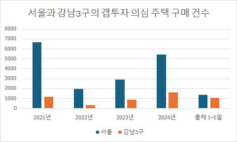 강남3구만 살펴보면 2021년엔 갭투자 의심 주택 구매 건수가 1155건에서 2022년엔 320건, 2023년 898건으로 급락하더니 작년 1624건으로 늘어났다. 올해는 5월까지 1064건으로 급증했다. 특히 3월은 525건으로 이 역시 최근 5년래 최대치였다.