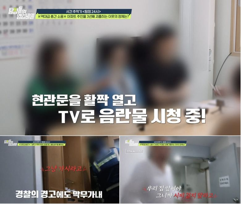 해당 아파트 주민들에 따르면 층간 소음 빌런의 만행은 여기서 끝이 아니었다. "어느 날은 현관문을 활짝 열고 TV로 음란물을 시청하는 모습이 목격되기도 했다"라는 한 주민의 제보에 모두가 말을 잇지 못한다. 그리고 층간 소음 빌런은 항의하는 주민들에게 침을 뱉고 문을 발로 차거나, 위협을 가하는 위험천만한 행동도 서슴지 않았다. 무엇보다 이런 피해가 3년 동안이나 이어지며 주민들은 극심한 정신적 피해까지 호소한다.